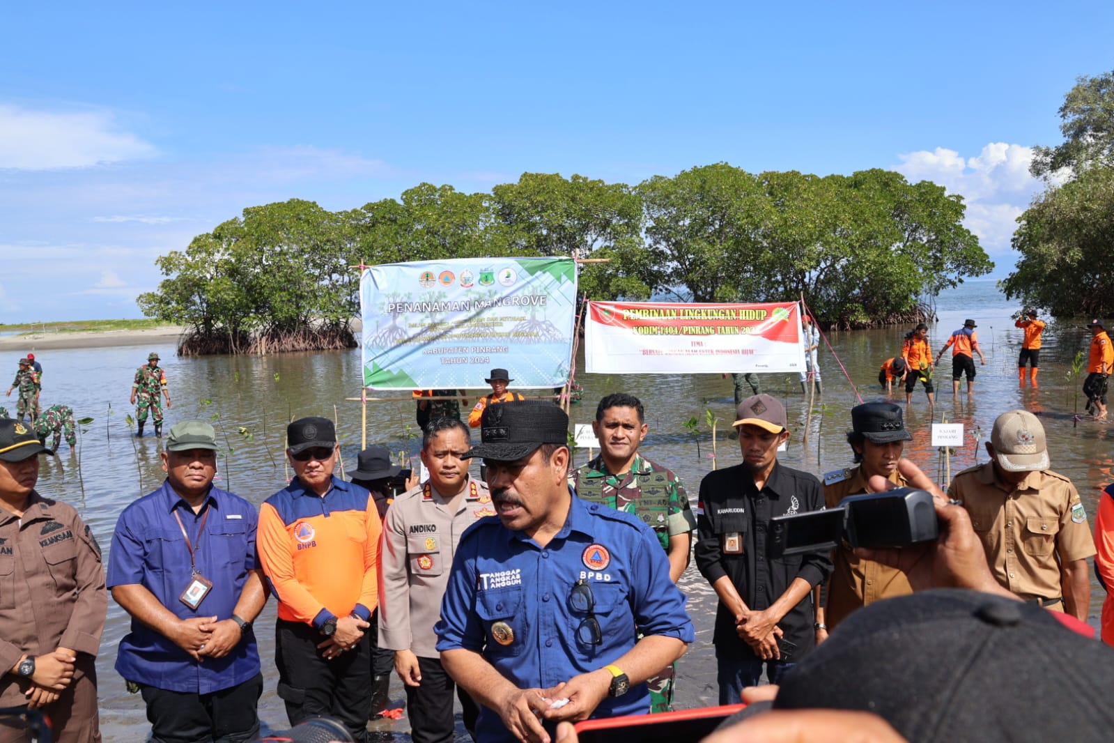 Sementara itu, Kepala Pelaksana Badan Penanggulangan Bencana Daerah (BPBD) Kabupaten Pinrang, Dr. Rhomy R.M. Manule, menyampaikan bahwa penanaman mangrove merupakan salah satu bentuk mitigasi bencana melalui pendekatan vegetasi.