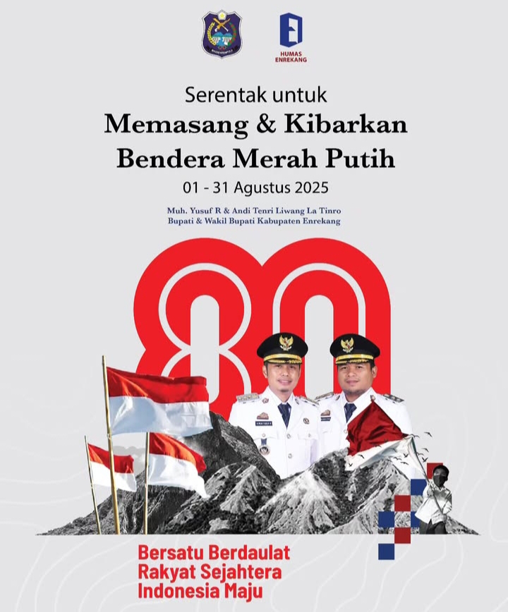 Enrekang– Dalam rangka memperingati Hari Ulang Tahun (HUT) ke-80 Kemerdekaan Republik Indonesia, Pemerintah Kabupaten Enrekang mengajak seluruh masyarakat untuk mengibarkan Bendera Merah Putih secara serentak mulai tanggal 1 hingga 31 Agustus 2025.