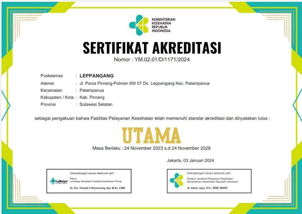 Pinrang – Puskesmas Leppangang berhasil meraih akreditasi perdana dengan predikat Utama, sebuah capaian yang sangat membanggakan bagi seluruh tim dan masyarakat di wilayah kerja Puskesmas Leppangang (9/1/2024).